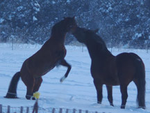 Vikingo, a Paso Fino stallion, and to his right, Danny, a grade Percheron, at play. You can tell they are playing and not angry because their ears are tilted to the sides or straight up. Also they aren't trying to bite or strike each other with their hooves. At the bottom right they end their play fight with a side-by-side gallop.